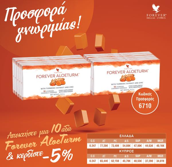Η διατήρηση ενός υγιούς ανοσοποιητικού συστήματος είναι ζωτικής σημασίας και το Forever AloeTurm™ είναι ένα επαναστατικό ζελεδάκι για την υποστήριξη του ανοσοποιητικού.Αυτή η μοναδική σύνθεση που περιέχει κουρκουμά από την Ινδία και ψευδάργυρο, έχει σχεδιαστεί για να υποστηρίζει την υγεία του ανοσοποιητικού ως μέρος της ευεξίας μας.Ο κουρκουμάς είναι ένα αρχαίο Αγιουρβεδικό βότανα και έχει χρησιμοποιηθεί ευρέως.Αλλά μια από τις μεγαλύτερες προκλήσεις με τον κουρκουμά είναι η χαμηλή του απορρόφηση από τον οργανισμό. Με την καινοτόμο τεχνολογία στο ζελεδάκι, το Forever AloeTurm λύνει αυτό το πρόβλημα αφού διαλύεται στο στόμα σας και απορροφάται απευθείας από τονοργανισμό.Το Forever AloeTurm όχι μόνο προάγει την υγεία του ανοσοποιητικού σας, αλλά παρέχει μια χαλαρωτική αίσθηση και έχει υπέροχη φυσική γεύση μέντας. Συνολικά, αυτή η σύνθεση προσφέρει έναν βολικό τρόπο για να ενισχύσετε το ανοσοποιητικό σας.ΣΥΝΟΠΤΙΚΑ• Ζελεδάκι που διαλύεται και απορροφάται εύκολα• Κουρκουμάς που προέρχεται από την Ινδία• Ο κουρκουμάς απορροφάται απευθείας από τον οργανισμό χάρη στην τεχνολογία πουδιαλύεται εύκολα• Ζελεδάκια που διαλύονται στο στόμα και τα έχετε ανα πάσα στιγμή μαζί σας• Υποστηρίζει την υγεία του ανοσοποιητικού• Με φυσική γεύση μέντας